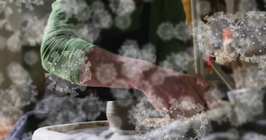 Image shows a potter working with clay at a wheel, with illustrations of virus cells overlaid. This visual captures the intersection of artistry and global health concerns, emphasizing themes of safety, hygiene, and persistence during challenging times. Useful for articles or promotions about covid-safe business practices in crafts or the impacts of the pandemic on artisans.