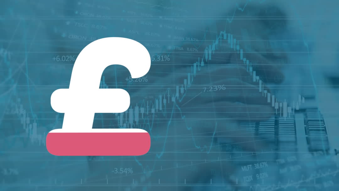 Graphic combining pound symbol and financial data charts illustrating economic trends and market analysis. Useful for materials related to finance, economic reports, and analysis on currency trading.