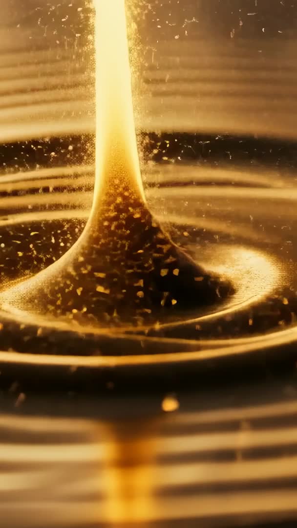 - Pouring golden viscous liquid forming mound with shimmering flakes and ripples | Macro video