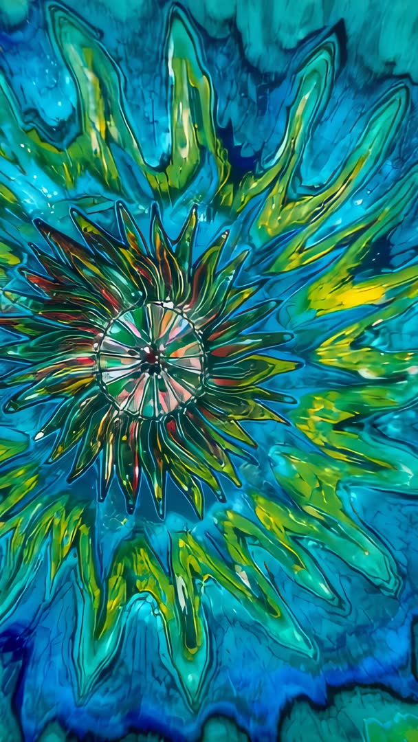 AI Generated Image. Vertical video showing first-pour mandala bloom on round panel, pulling radial petals outward with glossy pigments in vibrant teal, turquoise, yellow and green. Close-up circular motion revealing layered rays and lobes, creating kaleidoscopic center and flowing cell-like textures. Footage fitting for art process tutorials, social media reels, creative loops, gallery promo and abstract motion backgrounds. Editing suggestions: looping for seamless background, slowing for detailed petal reveal, color grading to enhance contrast, cropping for square or landscape formats. Use as texture overlay for packaging mockups, website hero, music visuals, meditation or wellness content, and instructional time-lapse demonstrating fluid painting technique.
