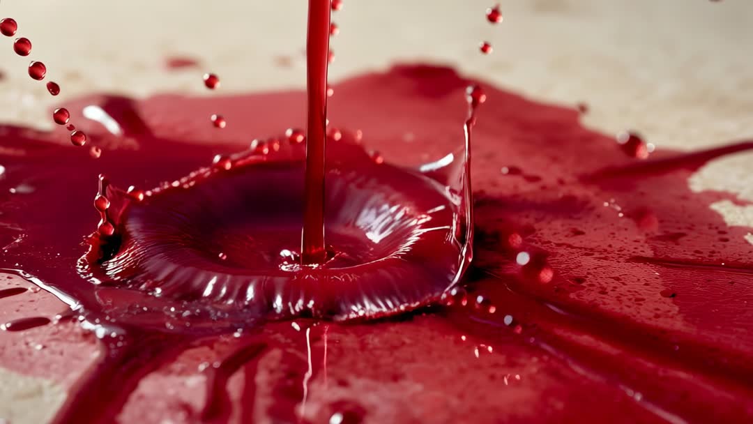 AI Generated Image. Close-up video showing pouring viscous red liquid forming crown-shaped splash and radiating droplets across beige countertop. High-speed capture emphasizing glossy texture, surface ripples, and dynamic fluid motion for dramatic visual impact. Ideal for commercial projects, food and beverage advertising, paint and color promotion, abstract background clips, and scientific demonstrations of fluid viscosity. Workflow ideas: use as looping background for websites, overlay for title sequences, texture fill for packaging, and frame grabs for print ads. Color grading allowing creation of wine, syrup, or paint concepts depending on project mood. Perfect for stock libraries, marketing campaigns, social media reels, product demos, art installations, and motion design templates.