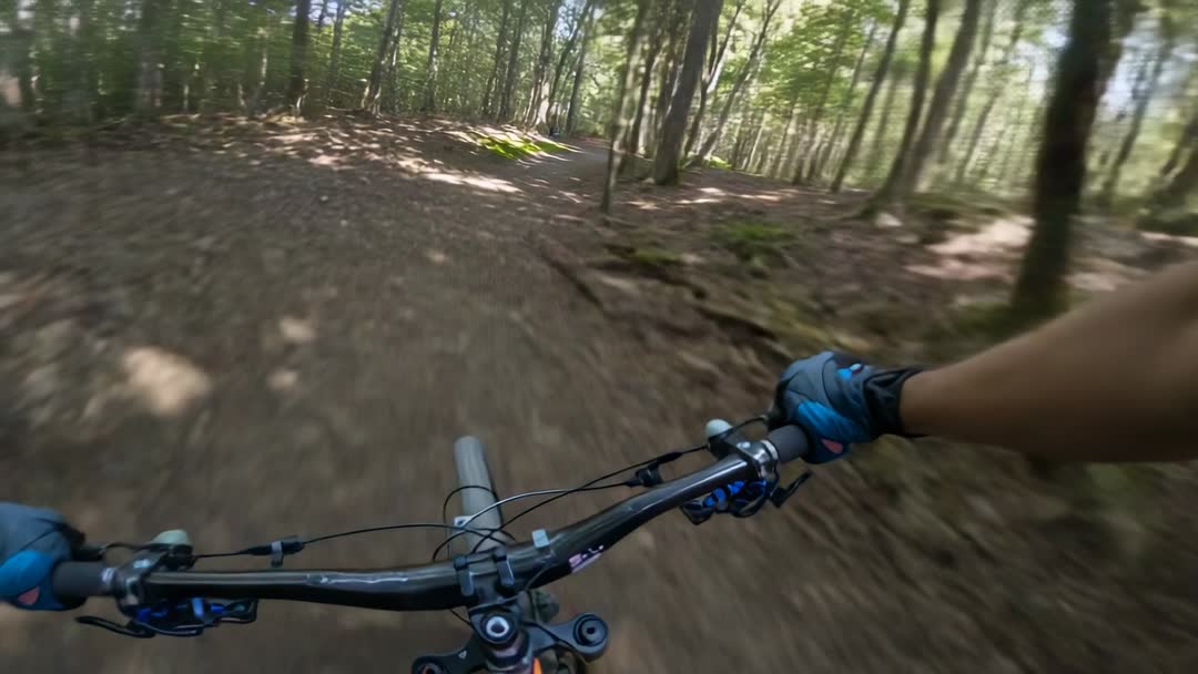 AI Generated Image. Video showcasing POV mountain biking down singletrack forest trail, capturing quick steering, root descent, and sunlight filtering through canopy while hands grip handlebars with blue gloves. Footage conveying speed and motion with motion blur and natural light, suitable for action sports and outdoor adventure content. Use for cycling tutorials, trail technique demonstrations, outdoor brand promos, product features for gloves and bike components, vlog openers, social media clips, and nature or travel B-roll. Editing suggestions include applying slow motion for technique breakdowns, adding upbeat soundtrack for promotional spots, and overlaying telemetry or route graphics for training or documentary projects.