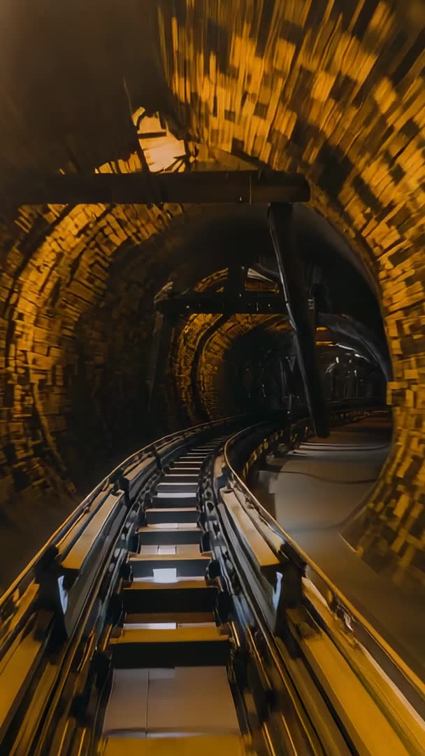 - POV rail ride through curved arched stone tunnel with warm golden lighting | vertical footage