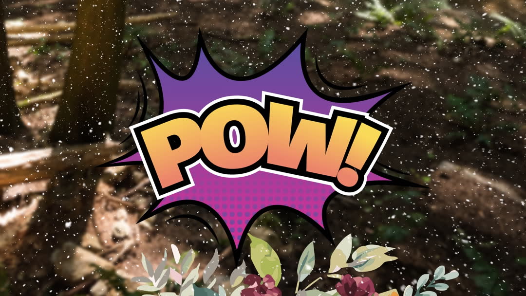 Pow comic text appears in vibrant, illustrated style with animated snow effect over a digitally rendered landscape. Ideal for use in creative multimedia projects, online promotional materials, or as a colorful backdrop in comic theme video presentations.
