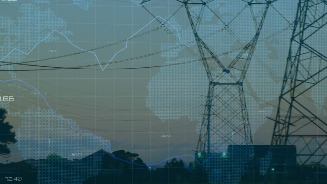 Showcasing towering transmission pylons silhouetted against dusk skyline with semi-transparent global map overlay and animated line and bar graphs tracking energy flows and market trends. Combining real-world infrastructure footage with digital analytics layers to communicate grid performance, demand forecasting, and cross-border power transfer. Delivering cinematic, data-driven visuals for corporate presentations, smart grid marketing, utility investor briefings, conference openers, broadcast news segments, website hero backgrounds, social media promos, and explainer videos. Pairing well with voiceover, infographic text, lower-thirds, and KPI overlays for storytelling about grid modernization, renewable integration, energy trading, infrastructure investment, and technology platforms.