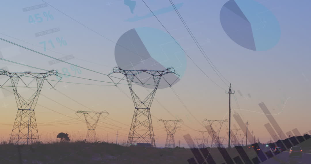 Power lines stretch across a landscape illuminated by a warm sunset, with various infographics overlaid, presenting data related to energy and consumption. The combination of real-world infrastructure and digital information highlights themes of energy management and technological advancement. Ideal for use in presentations on renewable energy, data analysis visual aids, or insightful discussions about electricity rates and infrastructure.