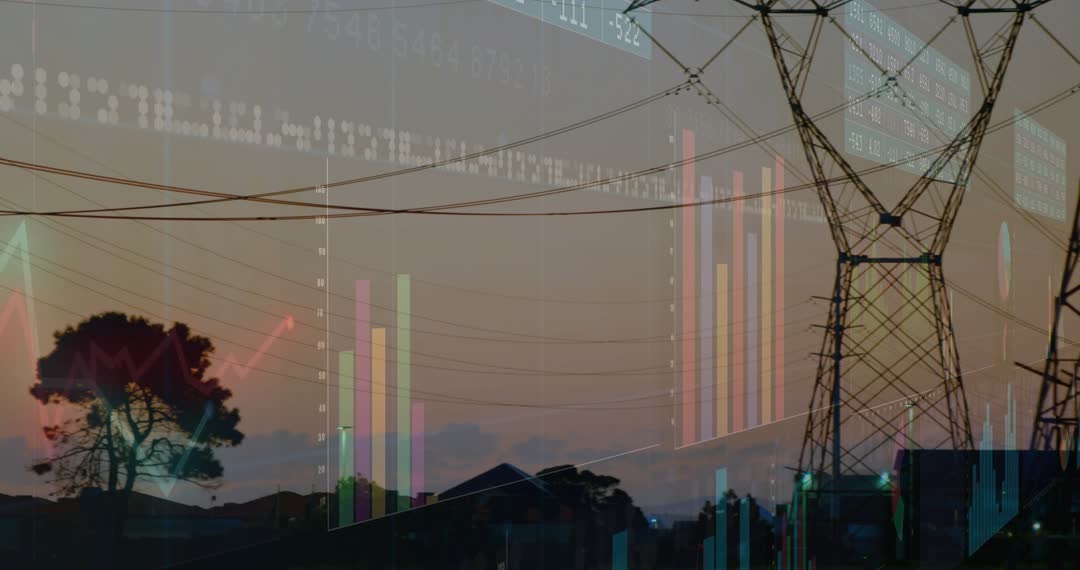Video showing power transmission towers silhouetted against dusk sky with layered animated charts and data lines conveying energy flow and grid analytics. Composition featuring tall pylons, network of power lines, distant tree and residential rooflines creating strong foreground-background contrast. Overlay including colorful bar charts, line graphs, numeric tickers and translucent HUD elements reinforcing smart grid, energy trading and utility monitoring themes. Use for corporate presentations, technology pitches, utility marketing, editorial coverage of energy markets, training modules on grid operations, and background for website hero or social media clips. Ideal for illustrating topics such as demand forecasting, real-time monitoring, renewable integration, infrastructure investment and digital transformation of energy sector. Stylistic notes: dusk lighting providing warm gradient sky, silhouettes adding dramatic contrast, chart overlays offering modern tech look; recommended usage in 16:9 sequences, slow parallax or time-lapse edits with subtle sound design for dramatic effect.