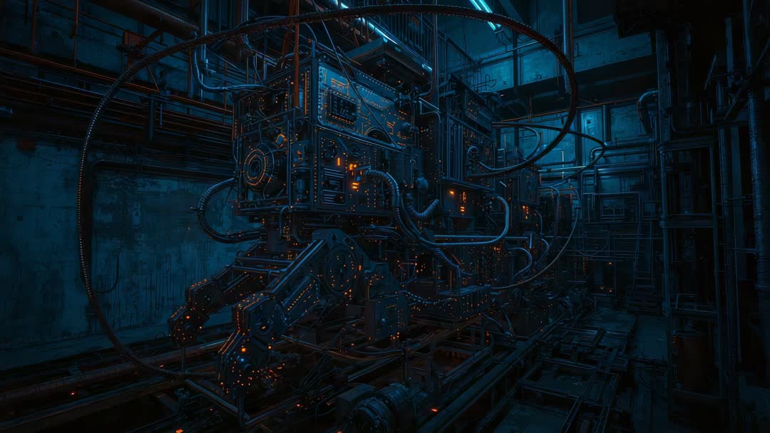 AI Generated Image. Detailed video showing a heavily industrial scene with mechanical rig in dark chamber. The rig is bustling with automated activity, indicated by numerous blinking lights and bundled cables. This ambiance highlights advancements in machinery and engineering technology. Can be used for themes involving industrial innovation, robotics, future infrastructure, or the complexity of automated systems.