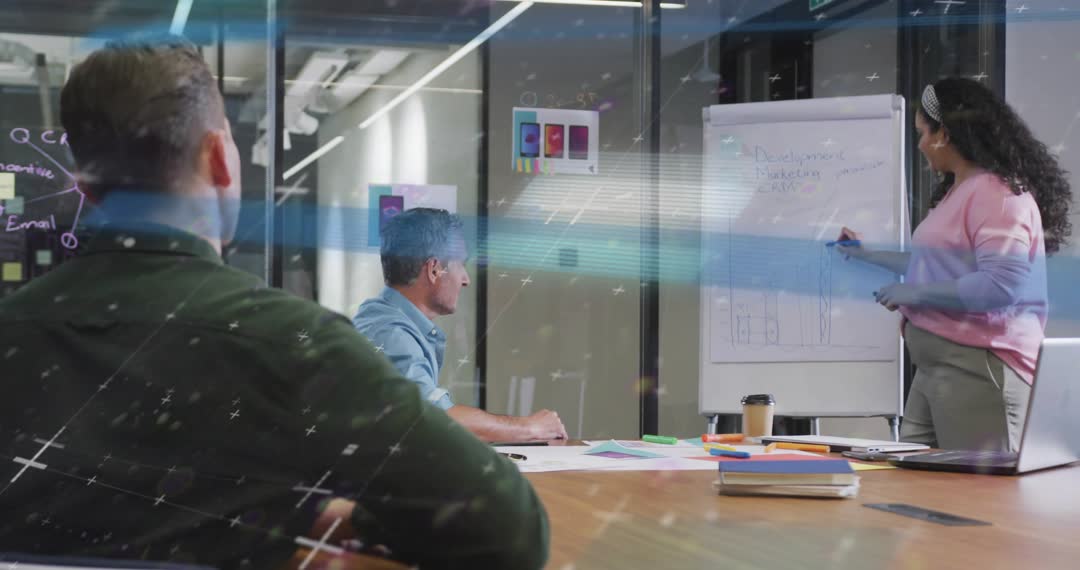- Presenter drawing on flipchart during collaborative office meeting with color bars passing