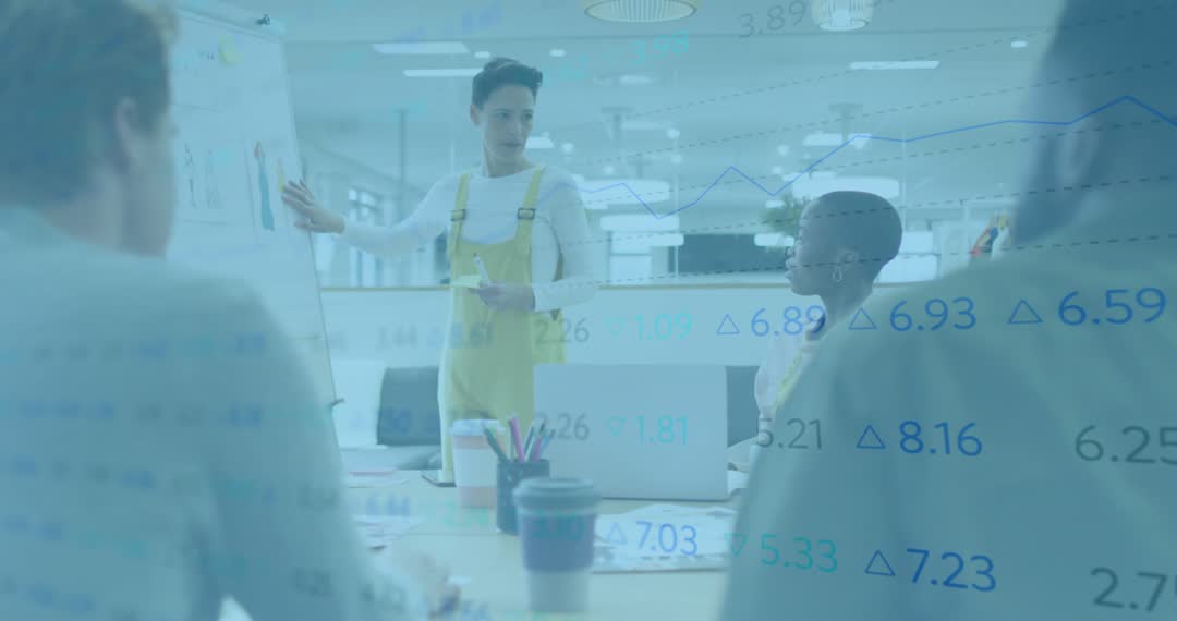 Professional woman displaying information with charts in business meeting. Team appears attentive, observing charts and data overlays, engaging fully with visual materials during presentation. Useful for themes on effective meetings, business collaboration, data-driven decision-making, or corporate training. Perfect for articles or resources focused on enhancing teamwork productivity and communication.