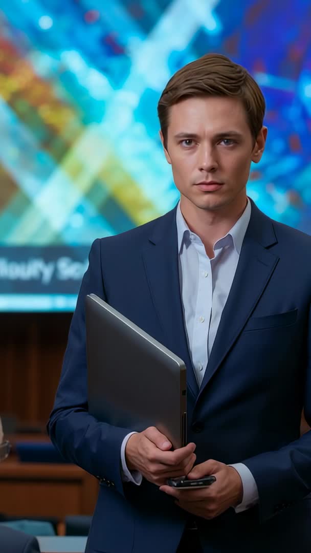 AI Generated Video. Vertical video showing young male presenter waiting with laptop and remote while colorful conference screen lighting up behind. Midshot framing highlighting poised posture, neutral expression, formal navy suit, and handheld technology. Background featuring abstract projection with bokeh highlights creating sense of anticipation and focus. Footage working well for corporate event promos, speaker introduction clips, keynote teaser reels, conference highlight reels, training modules, and social media vertical ads. Suggested uses include opening shot for live event stream, close-up cutaway for interview edits, promotional story for event registration, and background clip for corporate websites and slide decks. Color palette offering cool blue accents and warm highlights, suitable for professional branding and editorial coverage.