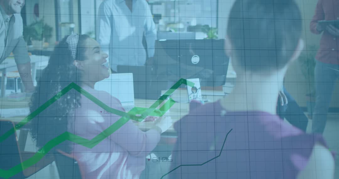 This captures lively exchange during a business meeting with animated growth graphs overlaid, demonstrating successful data analysis and collaboration. Ideal for illustrating business achievements, data-driven strategy narratives, team-oriented content, presentations on business growth, or leadership training materials.
