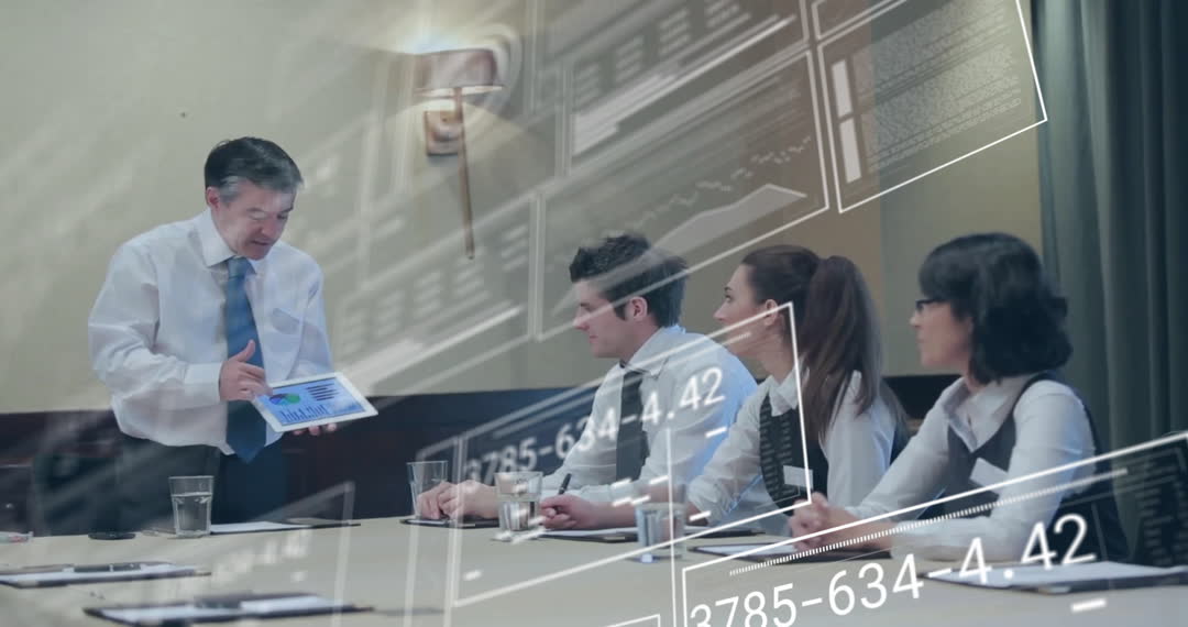 Business professional presenting financial data to a diverse team of colleagues, with digital data graphics overlay. This setting implies utilization of advanced technology for interpreting financial information. Suitable for illustrating modern business presentations, teamwork focus, technological advancements in corporate environments, and global financial strategies.