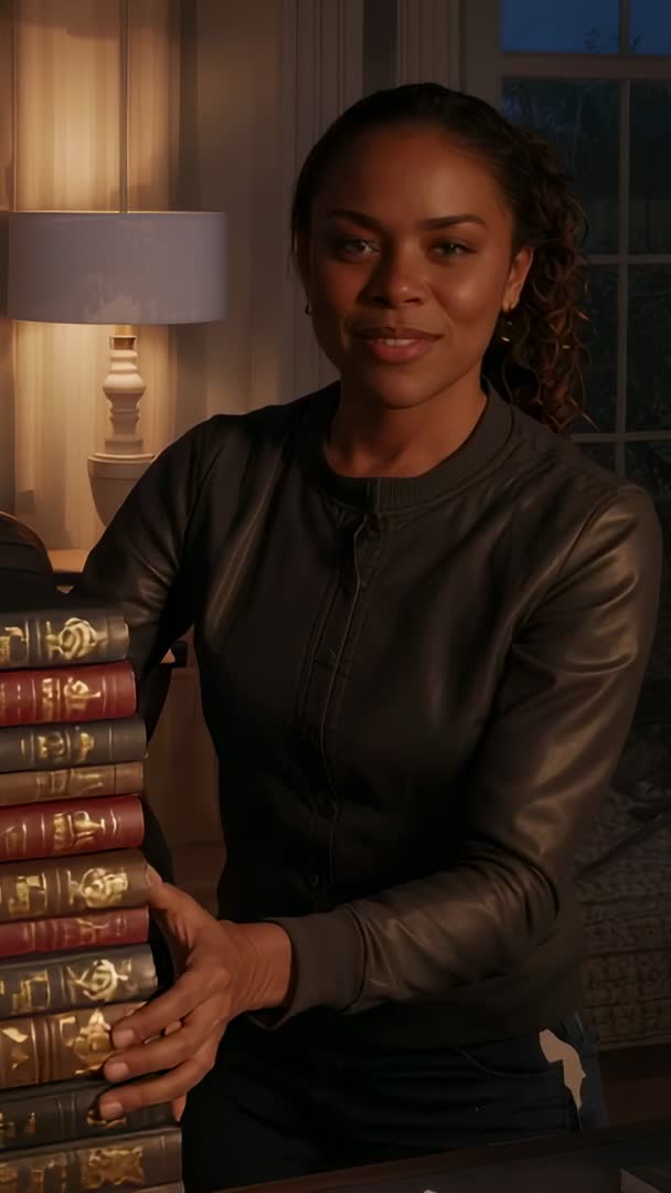 AI Generated Video. Filming showing woman wearing zip jacket holding stack of leather-bound volumes beside lit table lamp in cozy home study. Camera moving closer, framing upper body and embossed book spines under warm evening lighting, creating intimate mood. Presenter smiling while arranging antique books, suggesting storytelling, research, or book review content. Useful for author interview clips, book review reels, library or archive features, historical documentary promos, e-learning and literature channel intros, cozy home decor videos, evening routine content, social media vertical reels and mobile-first advertising. Suggestions for editing: pair with soft piano or acoustic soundtrack, add warm color grade and subtle vignette, cut to close-ups of embossed spines and hands, insert lower-third title and gentle voiceover. Delivering versatile B-roll for editorial, educational, and lifestyle projects.