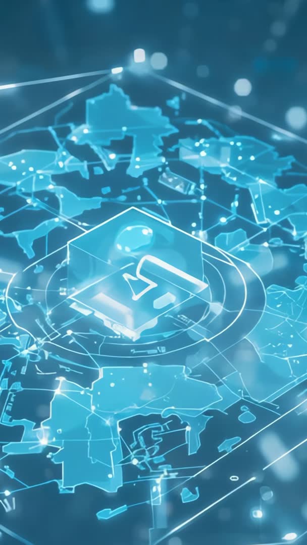 AI Generated Image. Showing finger pressing central glowing cube while holographic global map pulses across layered grid. Neon blue palette creating futuristic high-tech mood with dynamic light trails and node connections moving in 3D. Vertical format optimized for smartphone viewing and social stories. Ideal for use in tech product launches, app demos, network visualizations, blockchain explainer videos, cybersecurity campaigns, IoT presentations, startup pitch decks, UI walkthroughs, and social media ads. Suggest using as looping hero clip on landing page or landing screen, overlaying bold headline and call-to-action, and adding subtle parallax or slow zoom for depth. Recommend pairing with ambient electronic soundtrack and crisp UI sound effects, and using on-screen labels or animated data points to highlight key messages.