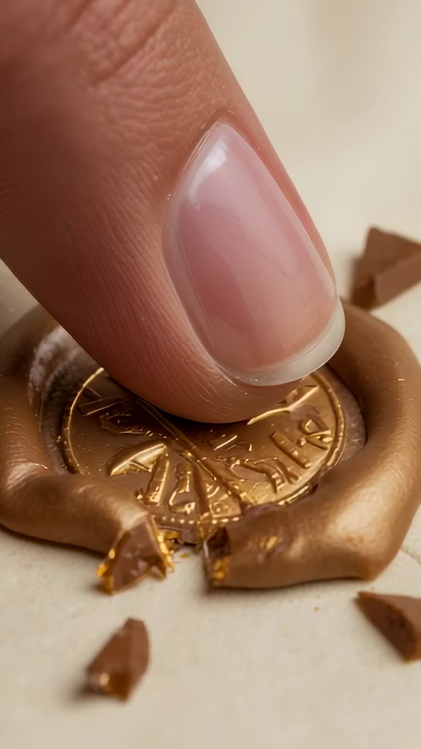 AI Generated Video. Showing extreme closeup of fingertip pressing metallic wax seal and cracking ring to reveal hidden gold token and scattered fragments. Nail and skin texture adding tactile realism while warm highlights accenting engraved coin detail. Neutral background keeping focus on seal action and debris. Suited for luxury branding, stationery and wedding invitation reveal, artisanal craft tutorials, packaging and unboxing sequences, authenticity and heritage storytelling, social media reels and vertical ads. Useful as cinematic b-roll for editorial on traditional sealing techniques, closeup transition clip, background for overlaying text or logo, or hero frame for product detail.
