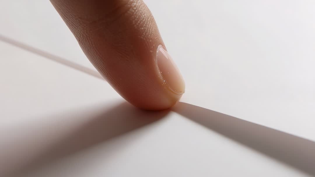 AI Generated Image. Showing fingertip pressing and flattening paper fold in macro detail, highlighting skin texture, nail edge, and soft shadow. Demonstrating tactile contact and delicate pressure used for smoothing paper crease. Suggesting use in stationery brand promotions, paper quality testing, DIY craft tutorials, packaging and product demonstrations, ASMR or sensory content, user experience metaphors, and educational videos about paper handling. Providing high-detail insert for film or commercial sequences, background clip for minimalist product ads, or visual metaphor for precision, care, and attention to detail. Pairing well with closeup sound design for ASMR, or slow-motion edits for dramatic emphasis and visual storytelling.