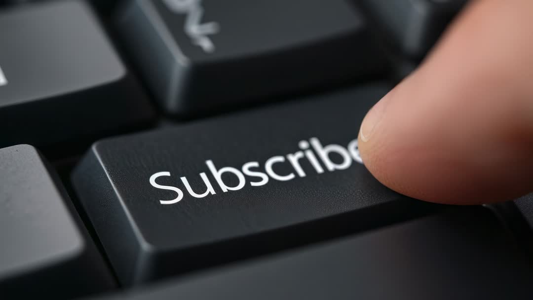 AI Generated Image. Closeup video frame showing fingertip pressing Subscribe key on black keyboard, confirming subscription action. High-contrast lighting and shallow depth of field focusing attention on key and fingertip, creating tactile, clickable feel. Footage working well for promoting newsletter signups, SaaS onboarding, YouTube channel subscriptions, email marketing campaigns, product trial signups, and conversion rate optimization content. Editors using tight crop for hero banners, horizontal framing for social media ads, and slow-motion segment for explainer videos. Suggested uses include website headers, landing pages, tutorial videos, app onboarding screens, marketing presentations, blog feature visuals, social posts, and ad creatives. Color grading and overlaying text fitting easily thanks to neutral background and clear typography. Avoid placing logos over key area to preserve legibility and leave space for call-to-action text.