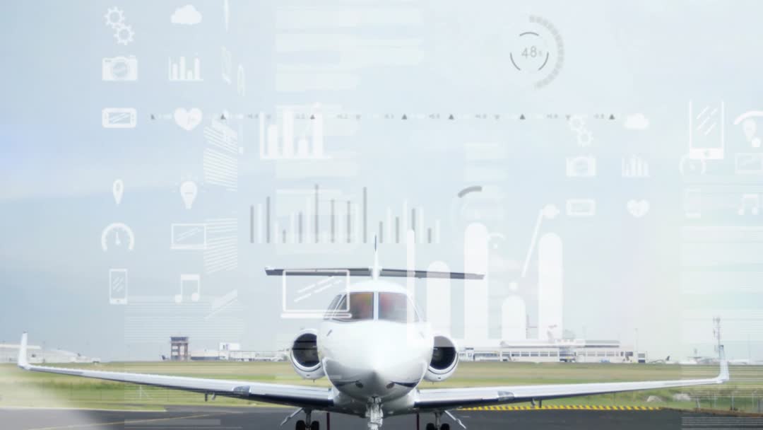 This video displays a private jet on a runway apron with a digital overlay of charts and technology-related icons rendered in 3D. The scene highlights modern connectivity and real-time data integration in luxury air travel, emphasizing cutting-edge technology. Perfect for use in corporate travel promotions, technology in aviation features, or marketing for innovative aviation solutions.