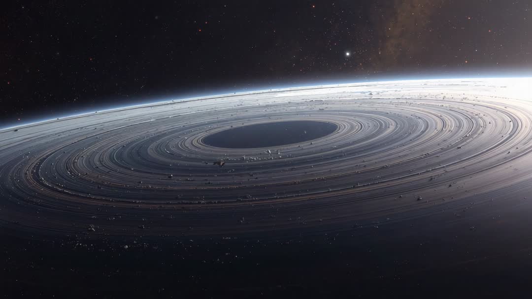 AI Generated Image. Panning probe-cam following drift along luminous planetary rings, revealing dark central gap and scattered debris above planet limb. Frame conveying scale, motion, depth with sunlight grazing ring edges and distant stars forming cosmic backdrop. Ideal for science documentary opening, VR space simulation intro, educational sequence on ring dynamics and orbital mechanics, sci-fi novel cover, cinematic trailer, or technology brand campaign. Suitable for widescreen banners, hero headers, video intros, social media clips, and print covers. Editing suggestions: color grading toward cool blues and muted warm highlights, adding subtle lens flare and motion blur for speed, applying slow dolly zoom for dramatic reveal, overlaying infographic labels for ring composition or gap measurements. Caption suggestions: "Exploring ringed world from low orbit", "Mapping dark gap and debris field around distant planet", "Probe-cam capturing orbital debris above limb".