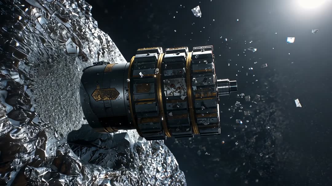 AI Generated Image. Sequence showing probe pulling back to reveal rotating cylindrical extractor hugging rocky asteroid, metal shards and fractured rock drifting outward while starlight glints off polished surfaces. Cinematic lighting creating high-contrast highlights and deep space background, emphasizing scale and mechanical detail. Visual conveying themes of space mining, deep space exploration, futuristic industry and orbital salvage. Useful for sci-fi film opener, aerospace pitch, mining technology presentation, concept art gallery, game trailer, magazine editorial, educational explainer, visual effects reel and website hero banner. 3D rendering details including realistic metal reflections, particle simulation and dramatic backlighting, suiting cinematic trailers and marketing campaigns.