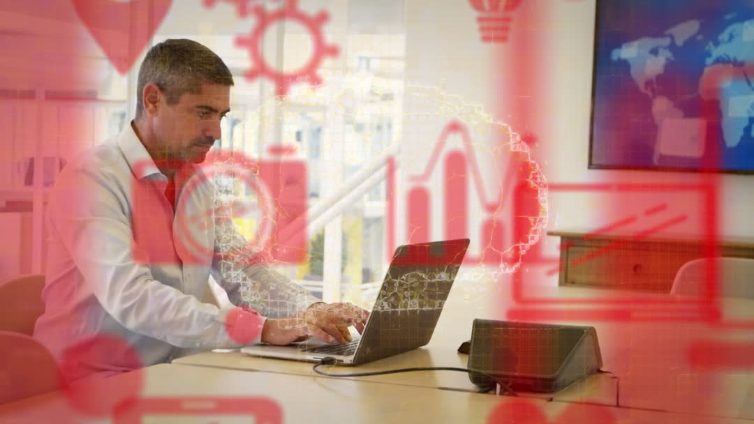 Caucasian businessman analyzing bitcoin trends using laptop in modern office with digital interfaces. Ideal for illustrating concepts related to cryptocurrency investment, digital technology integration, and modern business environments. Useful for websites focusing on financial consulting, fintech startups, and technology trends.