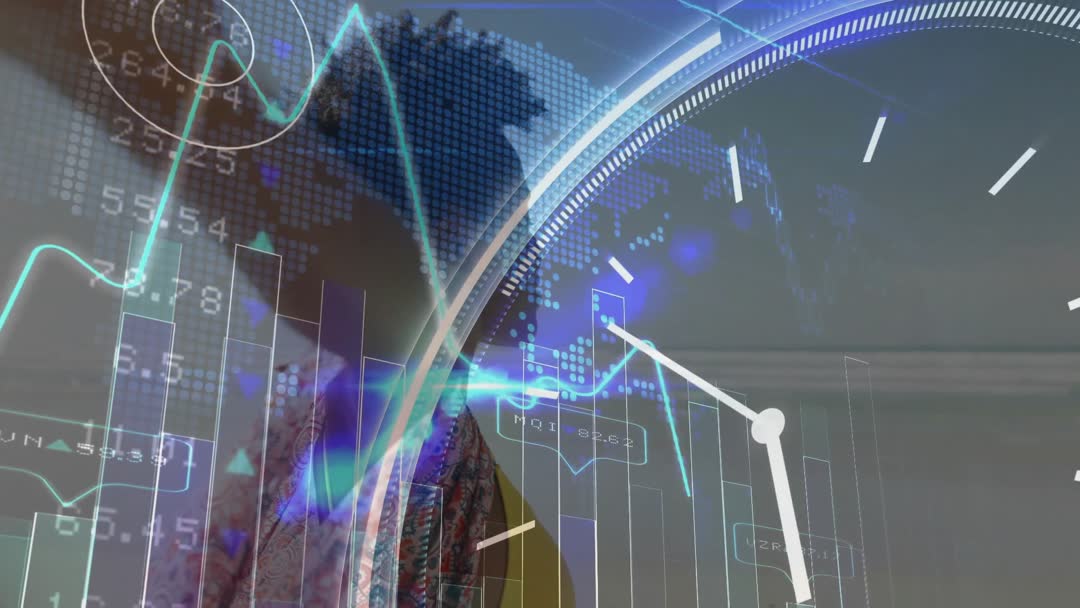 This video illustrates a professional in business attire with digital data and graphs superimposed, conveying themes of technology and innovation in analytics. Suitable for use in articles and presentations related to business strategies, corporate environments, advancements in data analysis, and educational tools in financial management and technology-driven sectors.