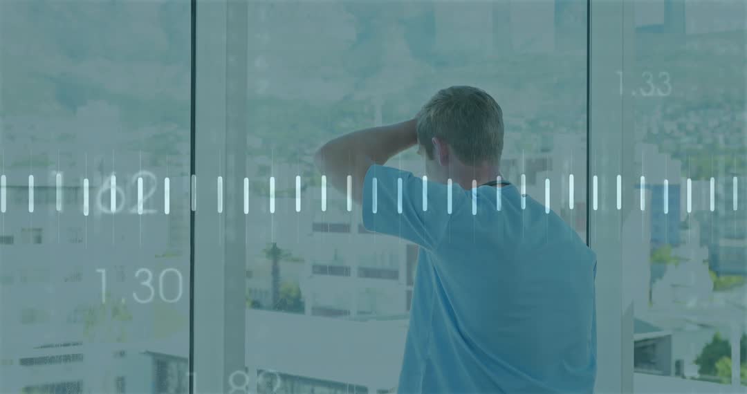Focusing on a man as tech visuals analyze urban view, showcasing technology use in modern analytics. Ideal for communicating ideas about futuristic workplaces, professional insight, or the role of technology in daily tasks.
