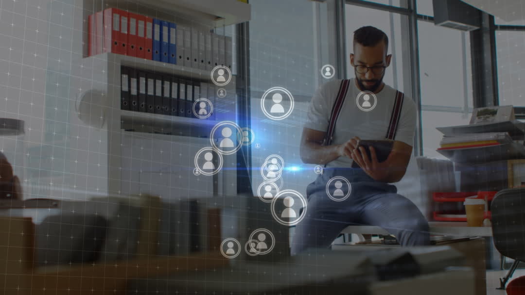 A modern professional engages with a digital interface on a tablet in a well-lit office environment. User icons connected by lines suggest networking and data processing. Ideal for themes related to technology, business strategy, professional innovation, and modern communications.
