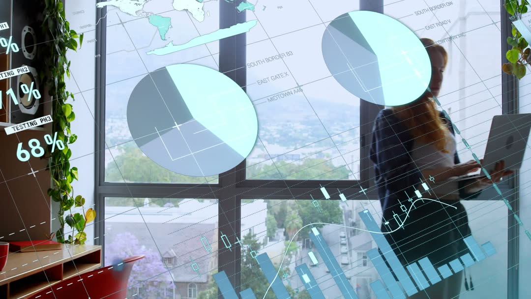 Person using laptop in office with digital graph and chart overlays symbolizes modern business technology and data analytics. Ideal for representing innovation, strategic planning or corporate environments in technology-focused campaigns, presentations, and articles.