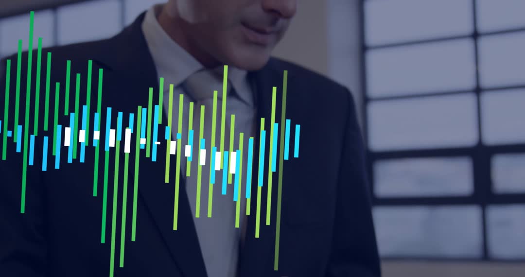 Businessman is reviewing sales data in a modern office environment, adding a sense of urgency and dynamism to the business atmosphere. Multicolored waveforms give a futuristic and tech-savvy vibe, suitable for illustrating themes related to corporate analytics, business technology innovations, or professional strategies. Ideal for content focusing on business growth, modern offices, and the integration of technology in analytics.