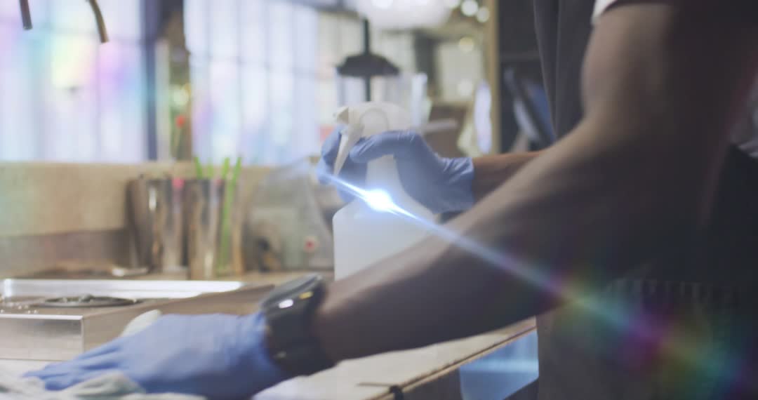 Arm of professional bar staff cleaning with spray bottle and cloth, emphasizing sanitation in hospitality environments. Ideal for use in articles or advertisements focusing on cleanliness standards in restaurants, cafes, bars, and maintaining hygienic food preparation environments.