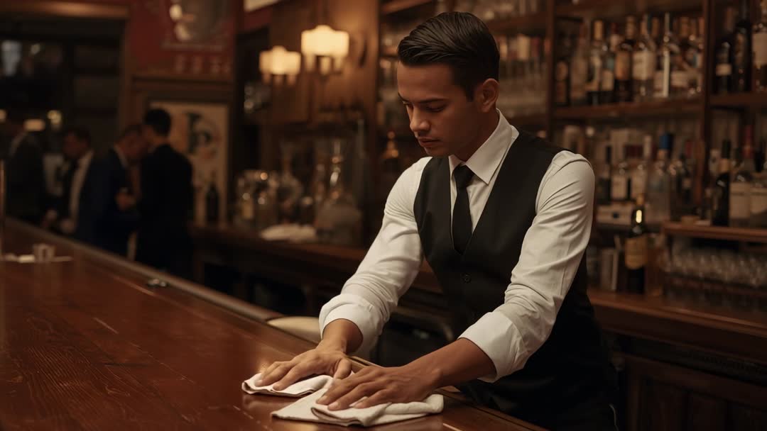 AI Generated Image. Bartender polishes bar counter in an intimate, warmly-lit bar. His smart attire signifies professionalism and excellence. Video conveys craftsmanship and attention to detail in hospitality settings, perfect for showcasing industry expertise, high-quality service, or creating ambiance-focused content.