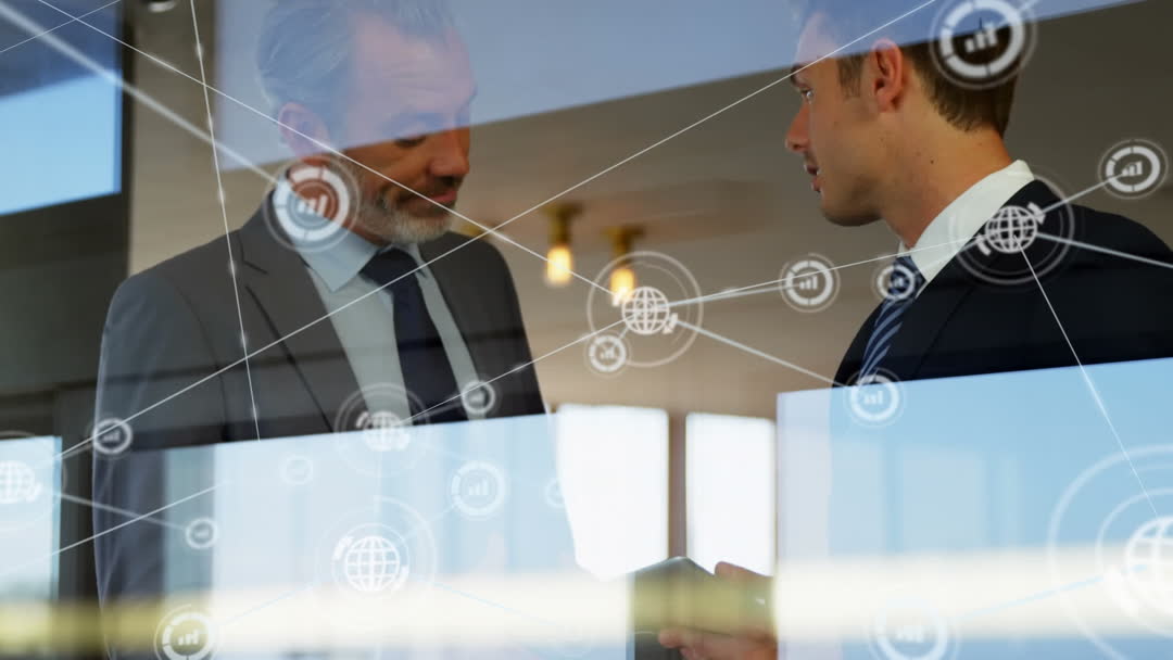 Two businessmen shaking hands conveys professional success and collaborative effort in a business network. The reflection indicates interconnectedness and shared goals. Useful for illustrating themes of business partnerships, networking opportunities, corporate discussions, and successful deal-making in presentations and marketing materials.