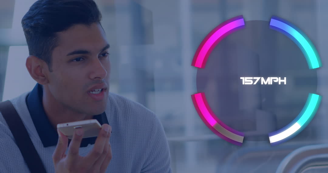 A professional wearing business attire engaging in a call while singlehandedly holding a smartphone. A digital neon speedometer graphic is overlayed, symbolizing progress or speed in technology or business developments. Perfect for content related to digital innovation, corporate communications, or technology solutions, suitable for articles or presentations emphasizing tech-driven business strategies.
