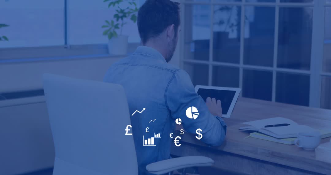 Business professional engaging with technology in contemporary office, displaying various finance charts and international currency symbols, ideal for illustrating concepts in financial analysis, entrepreneurship, and modern business environments. Suitable for corporate presentations, digital marketing, or articles on workplace technology.