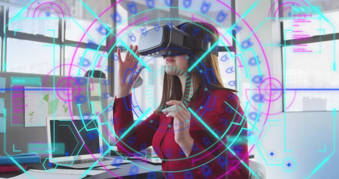 Video showing woman at desk putting on VR headset while holographic HUD overlaying modern office workspace. Interactive neon-blue and magenta UI rings and data panels surrounding head, suggesting immersive user interface navigation and gesture control. Hands reaching toward virtual controls while laptop and documents sit on desk, windows letting natural light into scene. Visual tone blending corporate professionalism with futuristic tech, suitable for conveying innovation and digital transformation. Use for marketing videos promoting VR training, corporate innovation, product demos; supporting UX and UI design presentations, e-learning modules, virtual collaboration tutorials; enhancing website hero banners, social media ads, investor pitch decks.
