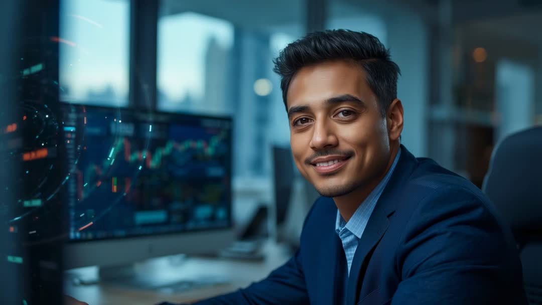 AI Generated Image. A South Asian man in a sharp suit sits at a desk in a high-rise office, smiling as colorful stock charts update on screen. His confident demeanor and professional appearance suggest success and expertise, ideal for marketing financial services, corporate coaching, or technology innovation. The high-tech ambiance with blurred office backgrounds works well for presentations and articles showcasing modern corporate culture and developments in AI-driven finance. Suitable for campaigns emphasizing diversity, professionalism, and innovation.
