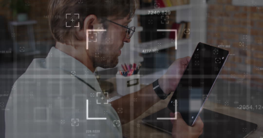 A professional man is using a digital tablet, focusing on a screen displaying dynamic data elements. Ideal for concepts related to workplace innovation, technology in business, and digital analytics. Useful in presentations exploring modern tools for data processing.