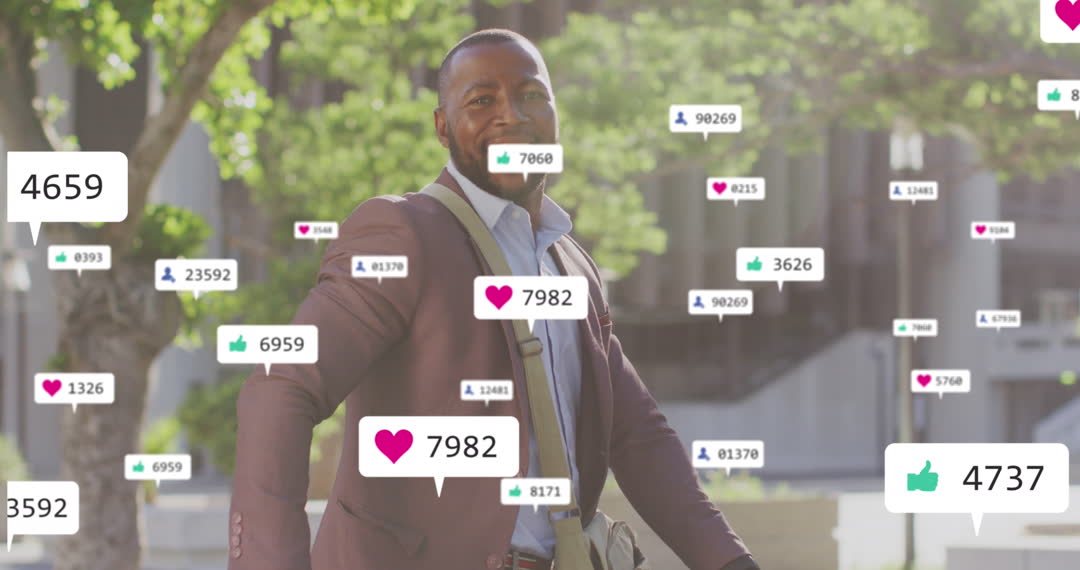 Professional man cycling through urban environment with social media interaction icons overlay. Biking symbolizes connectivity while icons of likes and follows indicate online engagement. Ideal for illustrating topics related to digital communication, social media influence, and modern lifestyle connectivity.