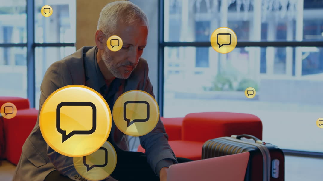 Depicts a gray-haired professional man interacting with digital social media icons in an indoor business environment. Suggests modern communication and networking dynamics in a professional setting. Useful for topics on technology, business communication, and social media impact on workspaces.