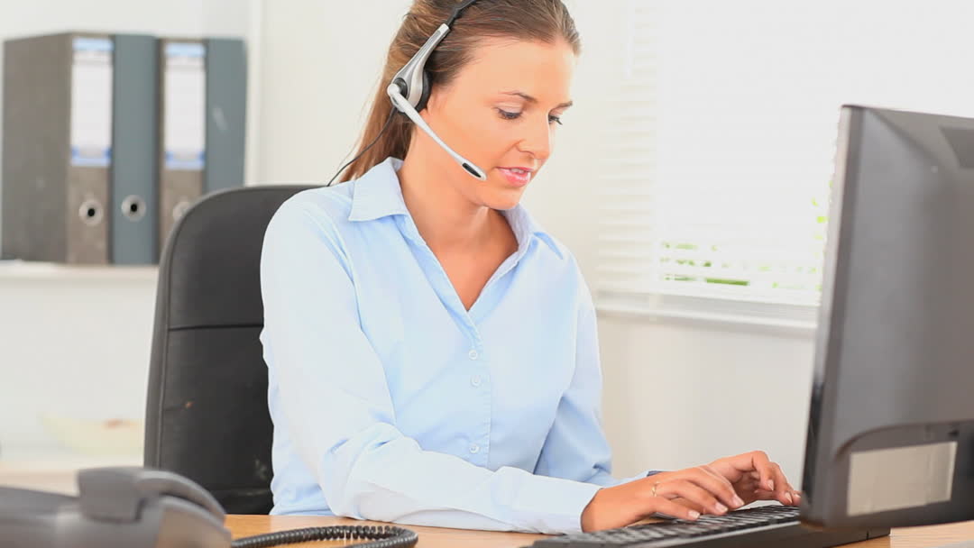 - Professional Office Worker Typing at Desk with Headset