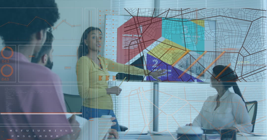 Businesswoman explaining complex data using modern visual tools to her colleagues. Scene shows collaboration and technology in a professional setting, ideal for illustrating corporate communication, teamwork advancement, or data-driven decision making. Useful for business presentations, team-building content, or tech advertisements showcasing digital solutions.