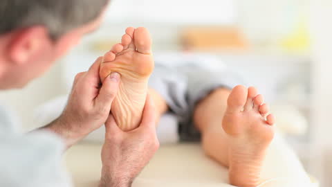 A therapist gives a reflexology massage, applying pressure on client's feet for relaxation and therapeutic benefits. This visual can be used for promoting wellness centers, spa services, health practices, or providing information about alternative therapies and self-care strategies.