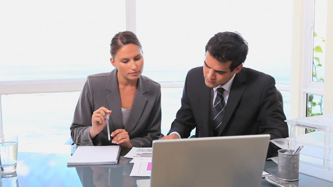 A man and woman dressed in formal suits engaged in reviewing documents and statistics on a laptop. With a background featuring broad windows letting in natural light, the scene conveys a focused and collaborative business environment. Useful for topics on business meetings, statistical analysis, teamwork, and corporate professionalism.