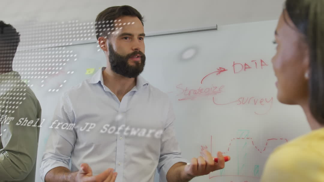 Group of professionals are discussing project plans, sketched on a whiteboard with words such as "data" and strategic notes visible, indicating a focus on analysis and project development. Superimposed tech graphics suggest digital topics or networking themes, suitable for articles or promotions about teamwork, corporate meetings, digital transformation, or educational materials illustrating collaborative work environments.