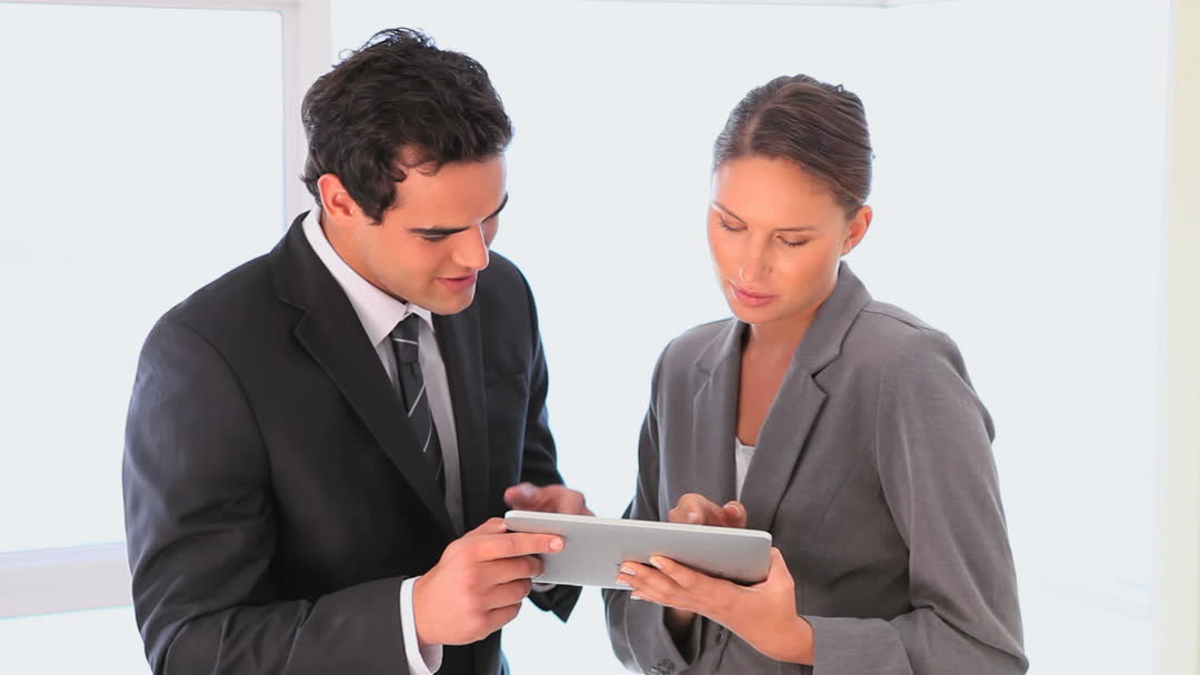 Two business professionals, a man and a woman, engaged in a discussion over a tablet display collaboration and communication skills essential in modern offices. Ideal usage for illustrating the use of digital communication tools in business settings, showcasing teamwork, and emphasizing professional dress codes and workplace interactions for corporate media and advertisements.