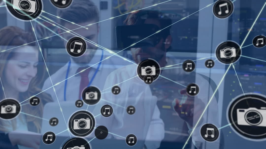 This visualization portrays a modern professional setting where a caucasian man engages with a virtual reality headset, surrounded by digital icons representing music and photography. The presence of wireframe connections adds depth to themes of business technology, digital connectivity, and innovation. Useful for tech-driven business presentations, articles on VR advancements, and marketing materials focused on modern collaborations and digital transformation.