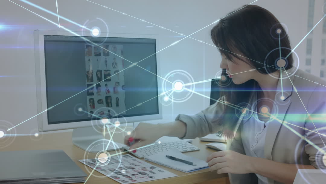 Woman thoroughly reviewing model portfolios on a computer, accompanied by an overlay of digital network connections, symbolizing communication and data analysis. Ideal for projects addressing technology in recruitment, future of work, or digital communication themes.
