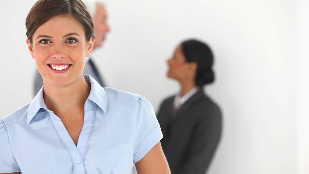 Young professional woman in business attire smiling, positioned prominently against blurred figures suggesting colleagues in a meeting setting. Perfect for illustrating corporate environments, team meetings, workplace diversity, professional achievements, and leadership concepts.